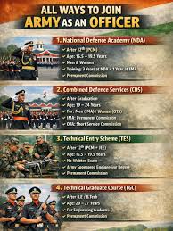 1. {NDA (National Defence Academy):] This is a direct route for high school pass-outs directly joining the Army based on age limits (16.5-19.5 years) and education (10+2 passed). NDA provides entry into prestigious positions with competitive salaries.